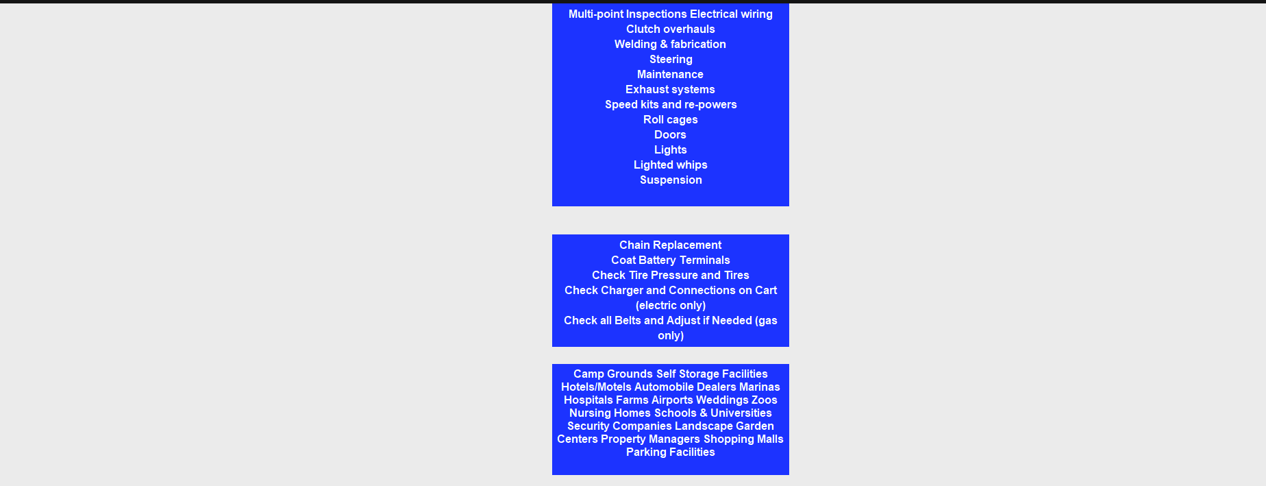 Our factory certified technicians are here to help whether your golf cart is down or just needs routine maintenance. We  UTV, ATV EZ-GO, Club Car, and Yamaha and all other manufactures. Onsite  for your golf cart to avoid a   we can come to you! options as well for jobs that are better suited for our shop. call charges are based on your location and parts and labor are additional. both gas and electric vehicles.